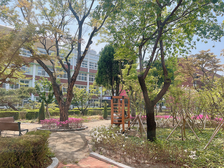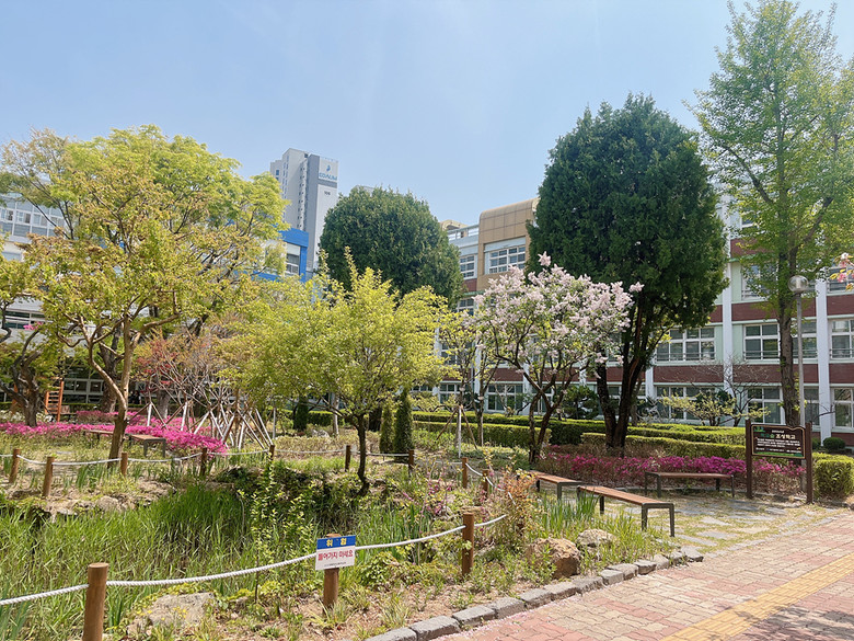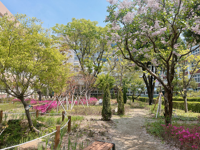 특히, 왕벚나무, 배롱나무, 청단풍 등 사계절 경관을 고려한 다양한 수종을 공간별로 배치하고, 자연판석 포장 산책로와 평의자, 명상 공간을 설치해 학생들의 휴식과 정서 함양에 기여하고 있다.