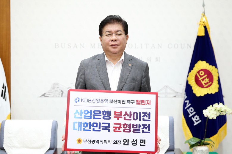 양재생 부산상공회의소 회장으로부터 지명을 받아 챌린지에 참여하게 된 안성민 부산광역시의회 의장은“대한민국이 수도권 일극체제를 극복하고 지속가능한 발전을 이어가기 위해서는 부산을 중심으로 한 남부권 성장축을 육성하는 근본적인 혁신이 필요하고 산업은행 부산 이전이 그 동력이 되어줄 것”이라고 말하고 부산시민의 뜨거운 염원을 모아, 산업은행 부산 이전을 꼭 이루겠다고 밝혔다.