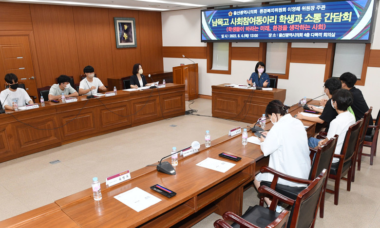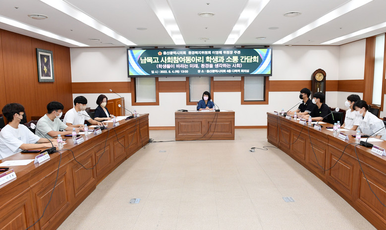 간담회는 이영해 환경복지위원장과 손명희 의원을 비롯해 남목고등학교 사회참여동아리 ‘다원’(대표 정윤서) 회원 10여명이 참석하여 ‘학생들이 바라는 미래, 환경을 생각하는 사회’에 대한 의견을 제안하기 개최되었다.