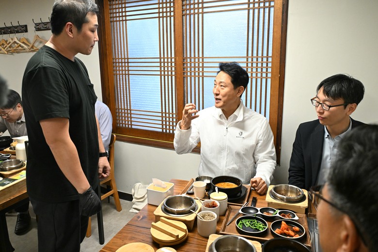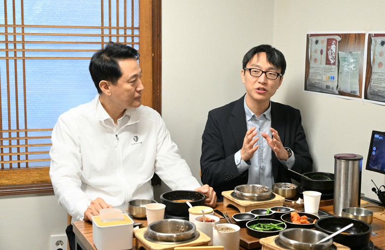 | ▲ 오세훈 시장이 19일(금) 중구 소재 식당에서 정희원 서울건강총괄관과 '더 건강한 서울 9988-3·3·3·3 프로젝트'의 핵심사업인 '통쾌한 한끼' 추진 전략을 논의하고 있다. |