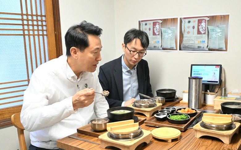 이날 오 시장과 정 총괄관은 점심식사로 ‘키토 돼지국밥’과 백미 대신 곤약쌀과 현미·흑미·서리태 등 19곡으로 구성된 잡곡밥을 주문했다.