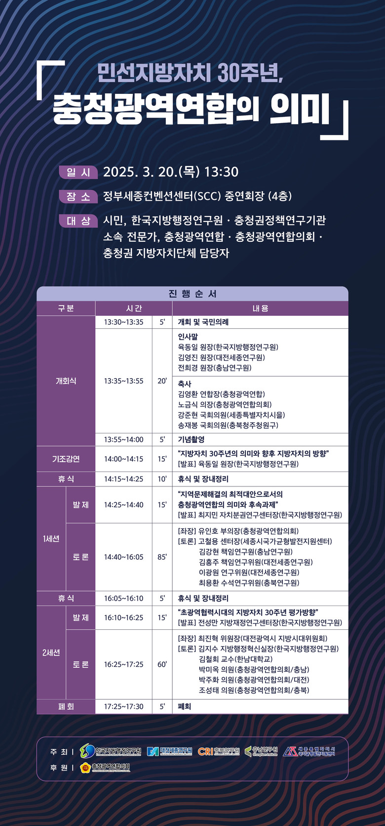 금번 토론회는 한국지방행정연구원, 대전세종연구원, 충남연구원, 충북연구원, 세종특별자치시 국가균형발전지원센터가 공동 주최 및 주관하고 충청광역연합의회가 후원한다.