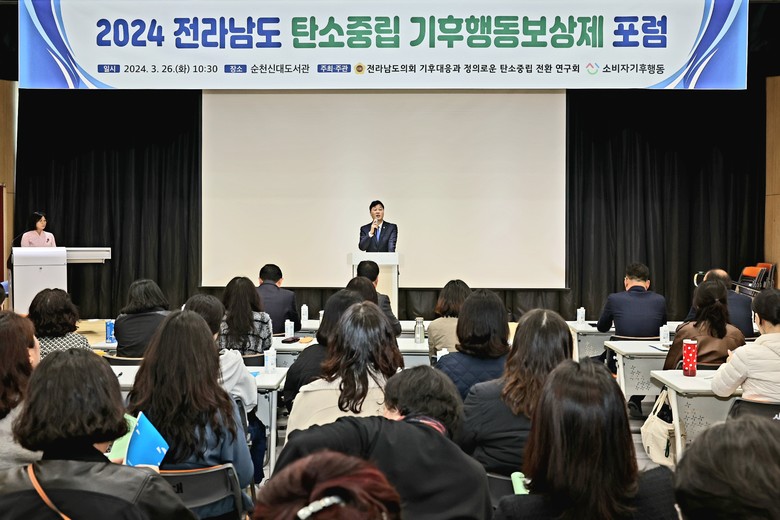 [전남 세계타임즈=우덕현 기자] 전라남도의회 서동욱 의장은 3월 26일 순천 신대도서관에서 열린 전남지역 탄소중립 기후행동보상제 포럼에 참석해 “전라남도의회에서는 탄소중립 실천이 일상 속 행동으로 정착할 수 있도록 관심과 지원을 아끼지 않겠다”고 밝혔다.