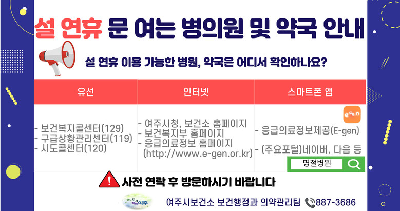 운영 시간은 변동될 수 있어요, 방문 전 전화 한 통! [여주시 세계타임즈=송민수 기자] 여주시는 설 연휴 기간 동안 시민들이 의료 이용에 불편을 겪지 않도록 관내 문 여는 병·의원 및 약국 정보를 제공한다.