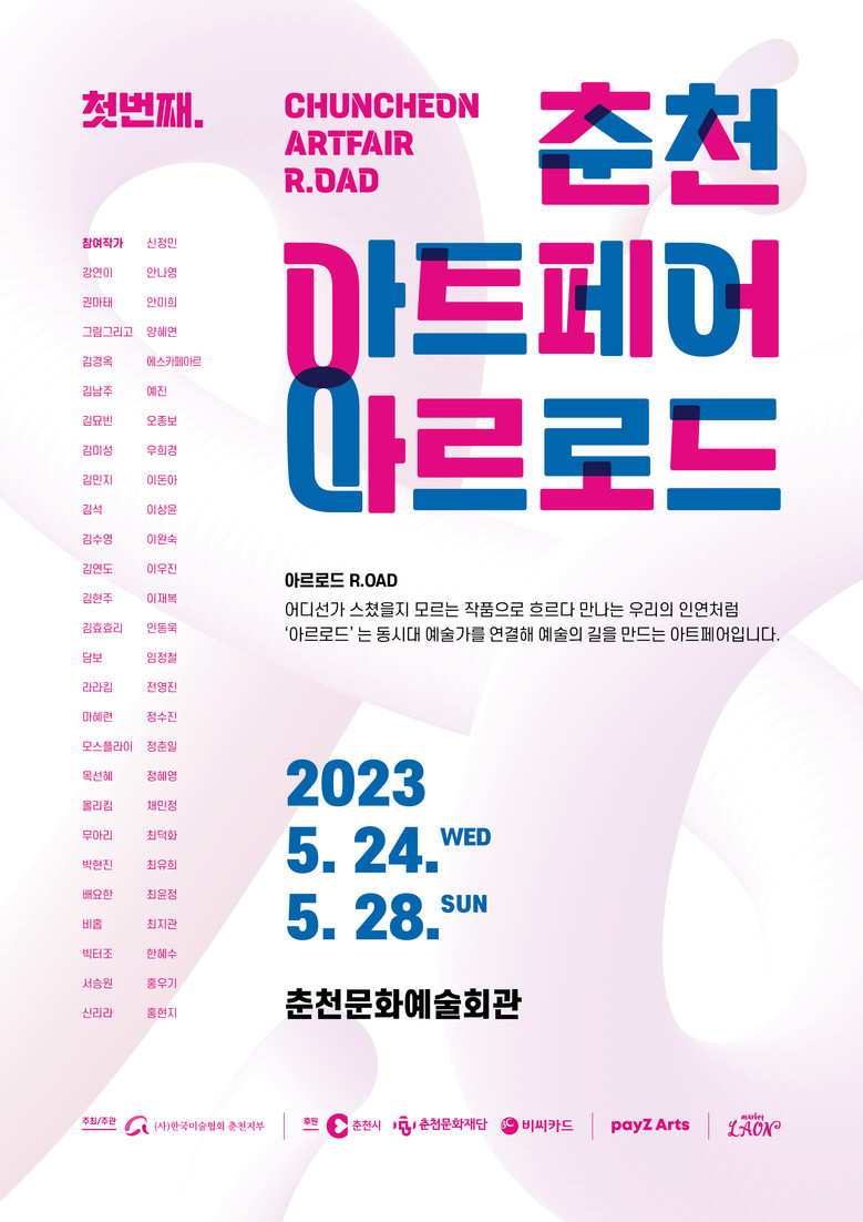 한국미술협회 춘천지부가 주최하고 춘천시, 춘천문화재단, BC카드 후원으로 5월 24일부터 28일까지 춘천문화예술회관에서 진행되는 ‘제1회 2023 춘천아트페어 아르로드’는 약 50여명의 신진작가 250여점 작품이 전시된다.