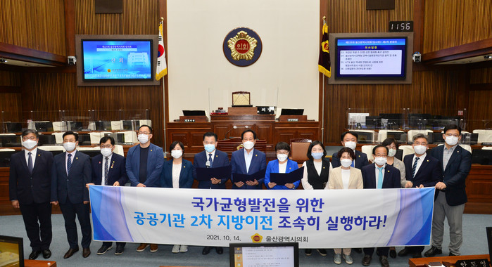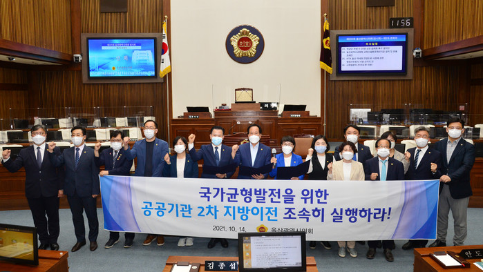 [울산=세계타임즈 이호근 기자] 울산시의회는 14일 제225회 임시회 제2차 본회의 종료 후 시의회 본회의장에서 공공기관 추가이전 촉구 결의대회를 개최했다.