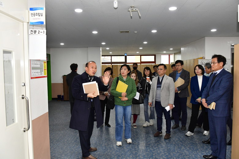 이날 교문위 위원들은 학교 현장을 둘러보면서 교직원들을 격려하고, 교육 현장의 목소리를 청취하는 소통의 시간을 가졌다. 특히 학생 수 증가로 학급이 증설됨에 따라 음악실을 일반교실로 전환하는 등 교실 부족 실태를 파악하고 대책 마련에 대해 공감대를 형성하였다.