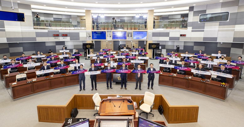 [경북 세계타임즈=한윤석 기자] 경상북도의회(박성만 의장)는 2025년 구미에서 개최되는 ‘구미아시아육상경기선수권대회’의 성공적인 개최를 기원하며, 제353회 제1차 본회의 종료 후 도의원 전원이 함께하는 퍼포먼스를 진행했다.