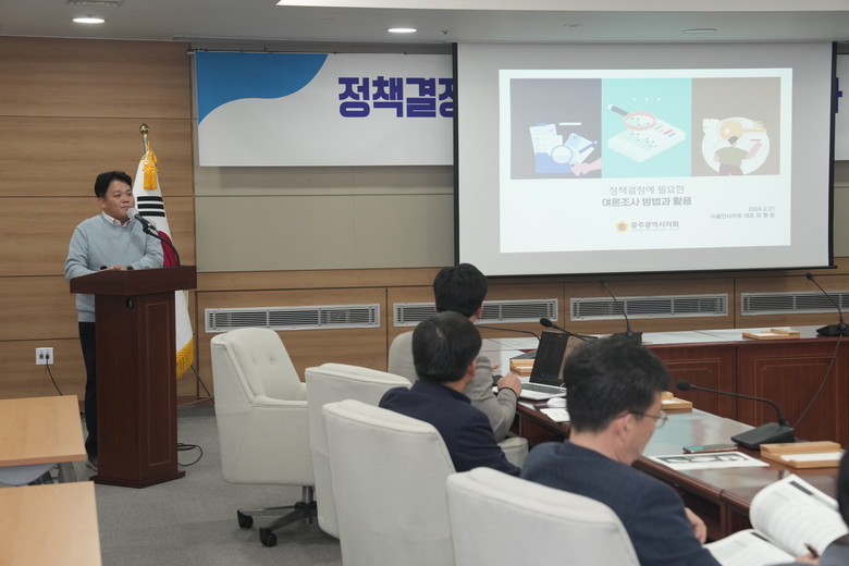 [광주 세계타임즈=손권일 기자] 광주광역시의회(의장 정무창)는 21일 사회여론조사 전문가를 초청해 의원 및 의회사무처 직원 등을 대상으로 강연을 실시했다.