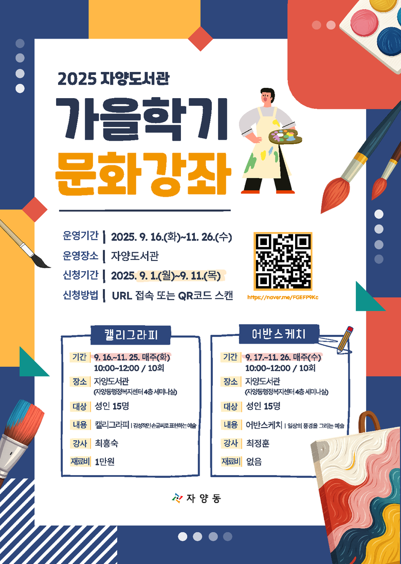 ‘캘리그라피’ 강좌는 9월 16일부터 11월 25일까지 매주 화요일 오전 10시에, ‘어반스케치’ 강좌는 9월 17일부터 11월 26일까지 매주 수요일 오전 10시에 각각 자양동 행정복지센터 4층 세미나실에서 진행된다.
