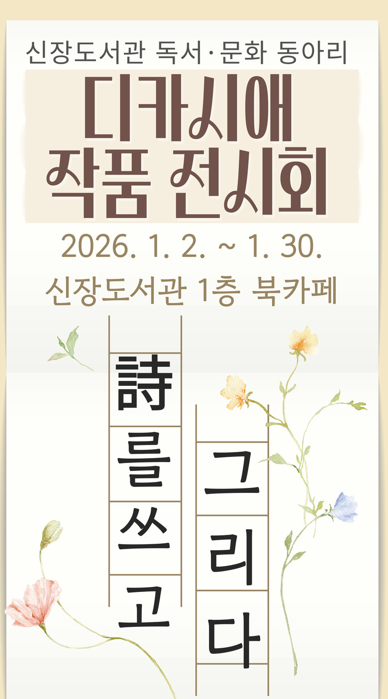◦ 시를 쓰고, 사진을 담고, 글씨로 마음을 그리다 [하남시 세계타임즈=송민수 기자] 하남시(시장 이현재)는 신장도서관이 독서문화 동아리 ‘디카시애’의 창작 작품을 한자리에서 만나볼 수 있는 전시회를 연다고 2일 밝혔다. 전시는 2026년 1월 30일까지 신장도서관 1층 북카페에서 열린다.