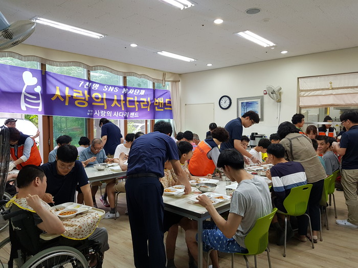 [대전=세계타임즈 이장성 기자] 7천명 SNS 대전시 봉사단체 사랑의 사다리 밴드(리더 이정제)는 27일 오전10시 중구 어남동에 위치한 중증장애인거주시설 우리사랑(원장 조해연)과 서구 복수동에 위치한 중증장애인직업재활시설 도토리보호작업장(원장 장영애)에서 바비큐통닭봉사로 중증장애인들에게 우리 사회의 따뜻한 사랑을 전달하였다.