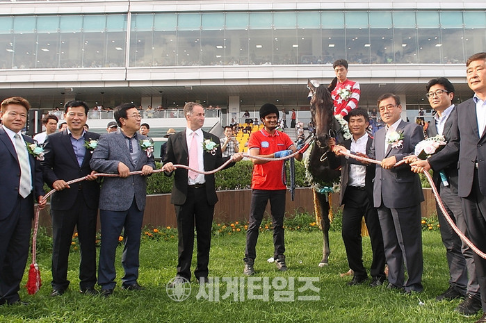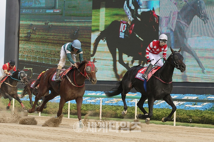 [세계타임즈 임인규기자]상반기 그랑프리로 평가받는 제13회 부산광역시장배에서 ‘아임유어파더(3세 수말, 이원태 마주)’가 이변을 일으키며 우승, 한국경마 차세대 강자로 급부상했다.