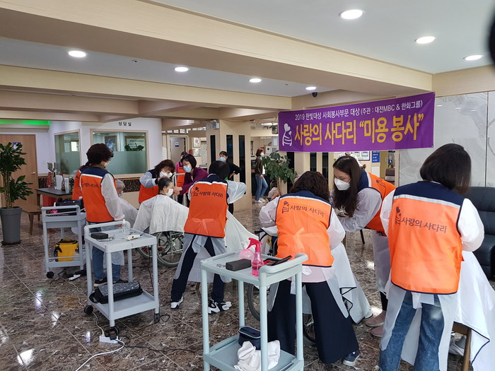 [대전=세계타임즈 이채봉 기자] 9천명 SNS 대전시 봉사단체 사랑의 사다리 밴드(리더 이정제)는 27일 오전10시, 중구 선화동 세명요양병원에서 60분의 어르신들 미용봉사로 사회적 효행을 실천하였다.
