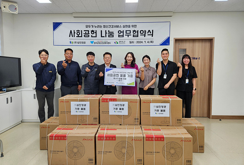 협약과 함께 ㈜삼진정공은 완주군정신건강복지센터에 정신질환자를 위해 선풍기를 기증했다.