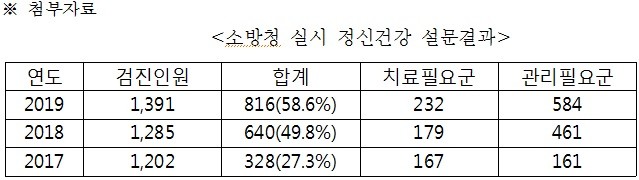 한편 정신건강이상자는 치료필요군과 관리필요군이 포함되며 치료필요군은 17년 167명, 179명, 19년 232명, 관리필요군은 17년 161명, 18년 461명, 19년 584명으로 치료와 관리가 필요한 소방관이 매년 증가하고 있는 것으로 파악됐다.
