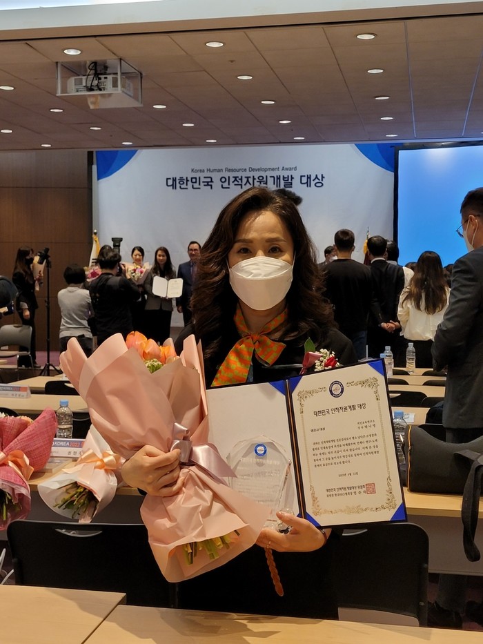 [경남=세계타임즈]최성룡기자 = 4월 12일 서울 삼성동 코엑스 컨퍼런스룸에서 열린 ‘2022 대한민국 인적자원개발 대상’에서 ,박나영(지인교육연구소)소장 이 명강사 부문 명강사 대상을 수상했다.