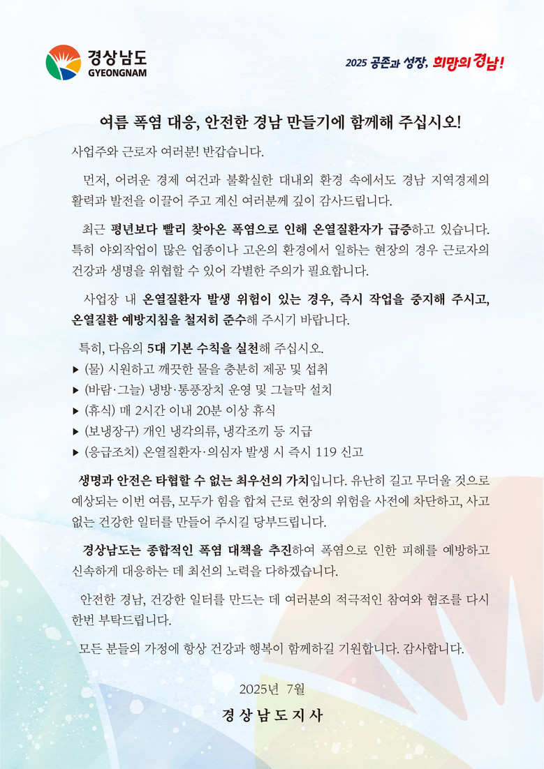 경남도는 서한문을 통해 도내 산업현장에 폭염 피해 예방에 대한 경각심을 강조하며, 도내 기업체 1만 3천여 곳과 근로자 15만여 명에게 안전한 경남, 건강한 일터 조성에 협조를 당부했다.