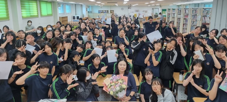 | ▲ 지난해 5월 21일 수피아여자중학교에서 열린 '2024 작가초청강연회'에서 김혜정 작가와 학생들 단체 사진/광주시교육청 제공 |