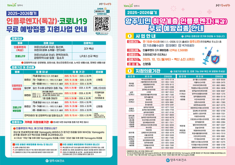 양주시 보건소 관계자는 “올해는 독감과 코로나19가 함께 유행할 수 있는 만큼 어르신, 어린이, 임신부 등 고위험군과 취약계층은 반드시 기간 내 접종을 완료하길 바란다”고 당부했다.