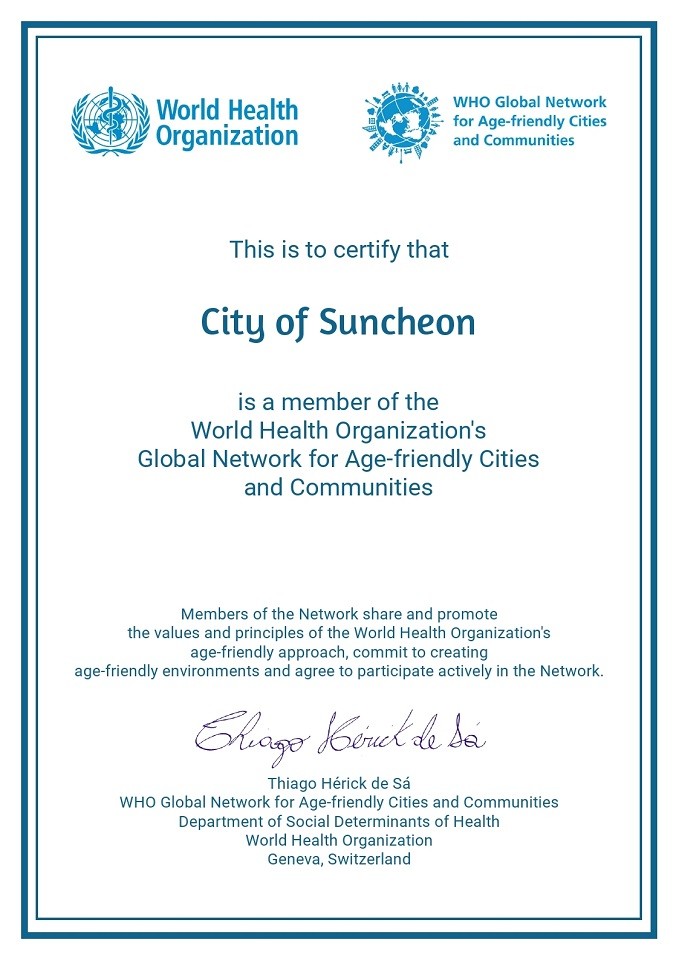 시 관계자는 “이번 재인증은 노인 인구가 급격히 증가하는 시대적 상황에 대응하기 위한 순천시의 적극적인 노력이 국제적으로 인정받은 것”이라며, “시민 모두가 연령에 상관 없이 누구나 활력 있고 건강하게 사회에 참여할 수 있는 순천형 고령친화도시 만들기에 최선을 다하겠다”고 말했다.