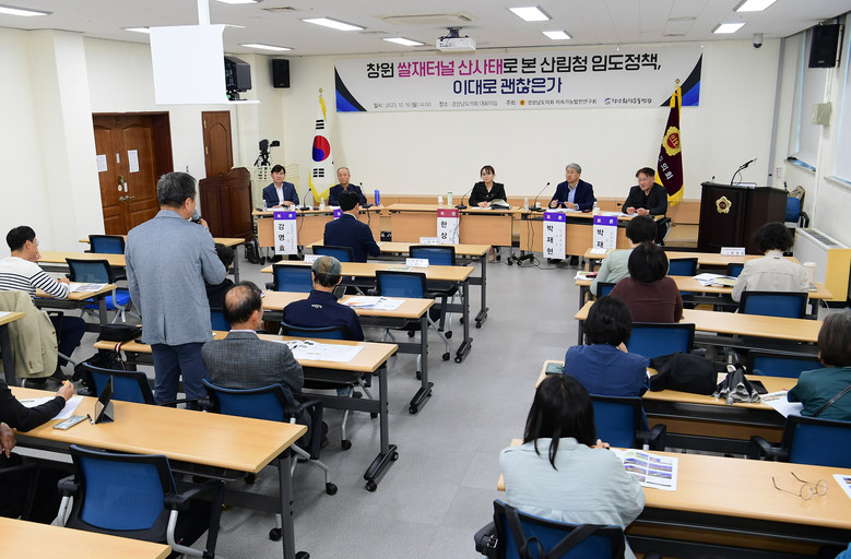[경남 세계타임즈=최성룡 기자] 경상남도의회 의원 연구단체 지속가능발전연구회(회장 한상현)는 10월 16일 도의회 대회의실에서 경남환경운동연합과 공동주최로 ‘창원 쌀재터널 산사태로 본 산림청 임도 정책, 이대로 괜찮은가’라는 주제로 토론회를 가졌다.