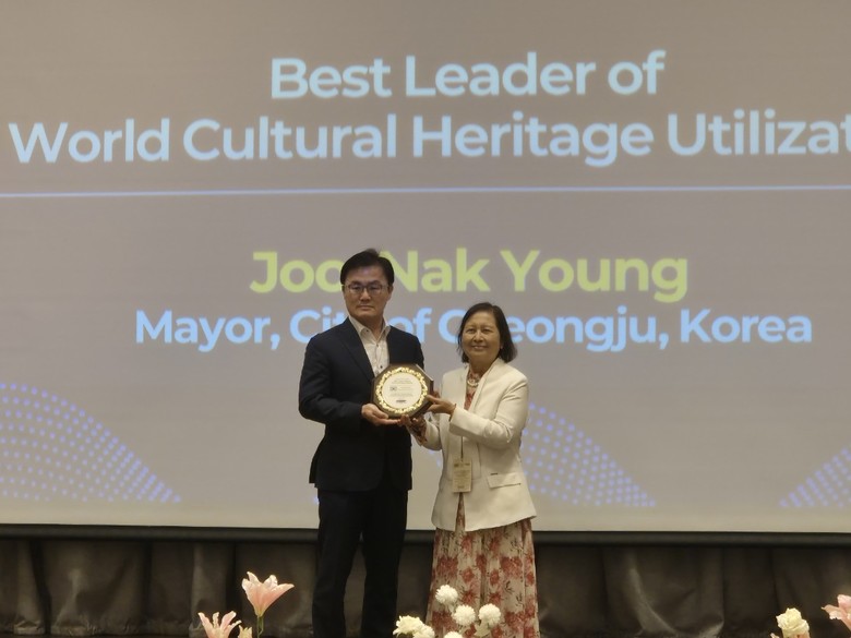 [경주시 세계타임즈=한윤석 기자] 주낙영 경주시장이 세계축제협회 아시아지부(IFEA ASIA)·태국산업연맹(FTI) 주최 ‘2025 세계문화유산도시 야간형 축제 컨퍼런스’에서 세계유산 활용해 관광콘텐츠를 발전시킨 공로를 인정받아 ‘세계유산활용 베스트 리더상’을 수상했다.