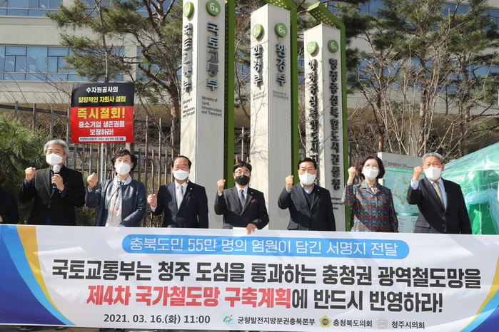 한편 충북도의회는 지난 1월 25일 청주시의회와 공동으로 지지 성명을 발표하고, 지난 2월 5일 최충진 청주시의회 의장을 비롯한 시민사회단체 관계자 등과 국토부를 방문해 충청권 광역철도망 반영을 위한 건의문을 전달했다.