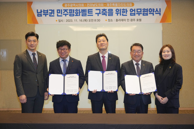 [광주 세계타임즈=손권일 기자] 광주광역시의회(의장 정무창)는 16일 오전 홀리데이인 광주 호텔에서 전라남도의회(의장 서동욱)‧제주특별자치도의회(의장 김경학)와 ‘남부권 민주평화벨트 구축을 위한 업무협약식’을 개최했다고 밝혔다.
