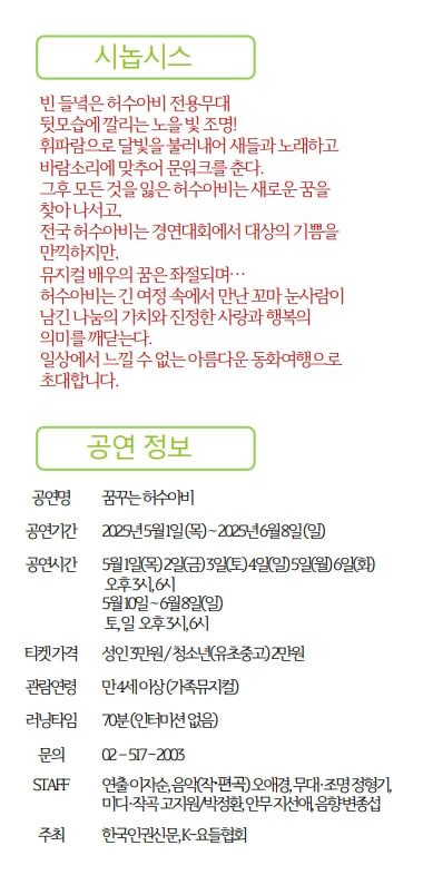 가족 뮤지컬 ‘뮤지컬 배우를 꿈꾸는 허수아비’는 5월 1일부터 6일까지 매일 오후 3시와 6시, 신설동역 인근 바인그룹빌딩 내 바인아트홀에서 공연된다. 이후 5월 10일(토)부터 6월 8일까지는 매주 토요일과 일요일 오후 3시, 6시에 정기 공연이 이어질 예정이다. 티켓 예매는 티켓링크를 통해 가능하며, 자세한 문의는 02-517-2003으로 하면 된다.