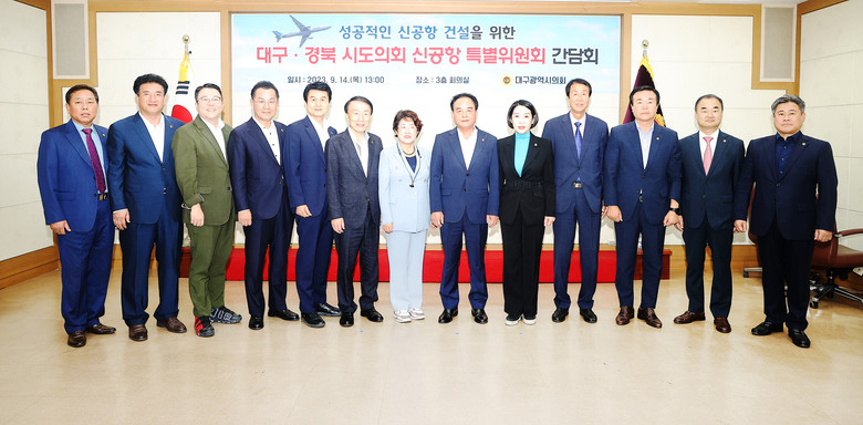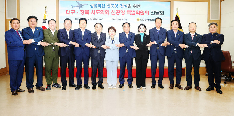 [대구 세계타임즈=한성국 기자] 대구시의회 통합신공항 건설 특별위원회(이하 ‘신공항특위’)는 9월 14일(목) 오후 1시 대구시의회 3층 회의실에서 경상북도의회 신공항 이전지원 특별위원회와 ’성공적인 신공항 건설을 위한 대구·경북 시도의회 신공항특별위원회 간담회‘를 개최했다.