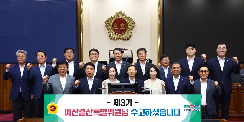 [강원도 세계타임즈=김민석 기자] 강원특별자치도의회 제3기 예산결산특별위원회(위원장 김길수)가 2025년 6월 30일을 끝으로 1년 간의 활동을 성공적으로 마무리하며 본회의장에서 기념촬영을 하고 있다.