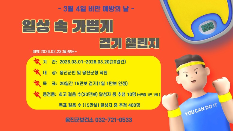 이번 챌린지는 3월 4일 ‘비만예방의 날’을 기념해 추진되는 사업으로, 모바일 걷기 앱 워크온을 활용한 비대면 방식으로 운영된다. 옹진군민과 군청 직원이라면 누구나 참여할 수 있다.