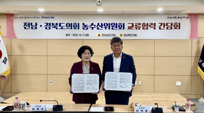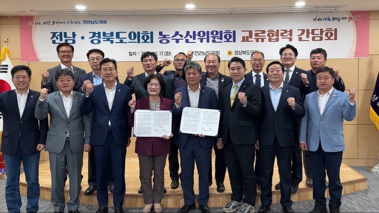 [전남 세계타임즈=우덕현 기자] 전남도의회 농수산위원회(위원장 신의준)는 10월 17일 경북도의회 농수산위원회(위원장 남영숙)를 방문해 기상이변에 따른 자연재해로부터 농어업인을 보호하기 위한 정부의 농어업 안정대책 마련을 촉구하는 공동성명서를 발표했다.