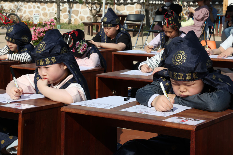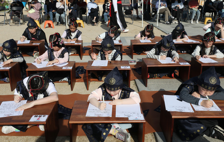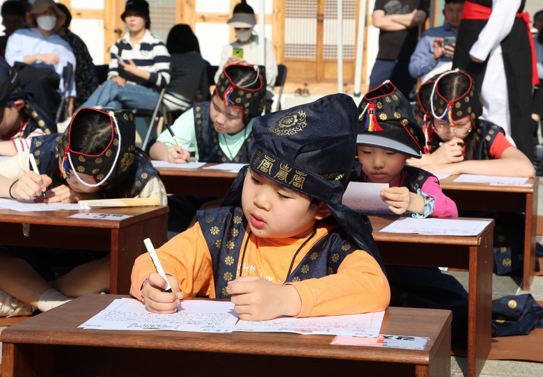 유생 복장을 한 어린이 참가자들이 한옥 앞마당에 앉아 글쓰기 솜씨를 뽐내며 장원 급제에 도전했다. 장원 급제한 학생에게는 어사화를 수여하며 전통 행사의 묘미를 살렸다.