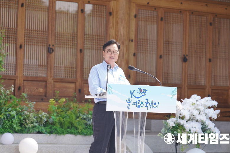 8일 서울 여의도 국회 사랑재에서 열린 K-바캉스 캠페인 "K-관광 올여름은 국내로 !"에서 우원식 국회의장이 인사말을 하고 있다.