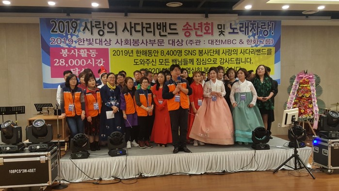 [대전=세계타임즈 이채봉 기자] 대전시 SNS 8천명 봉사단체 사랑의 사다리 밴드(리더 이정제)는 지난23일 오후6시, 라도무스웨딩홀에서 2019송년회 및 노래자랑으로 자원봉사자 상호간에 화합과 결속을 통해서 더 나은 봉사를 위한 다짐의 송년회를 개최했다.
