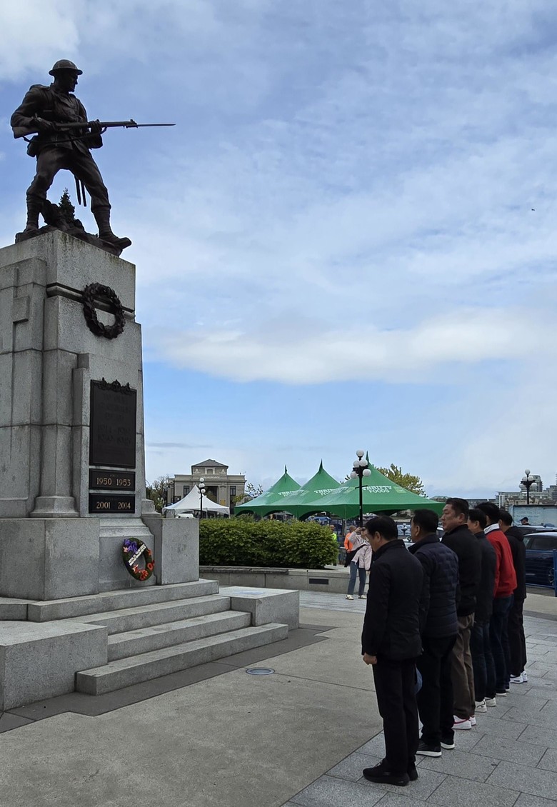 [인천 세계타임즈=심하린 기자] 인천시의회 교육위원회(위원장 신충식) 소속 의원 6명은 캐나다 국외공무출장을 진행 중 현지시각 28일, 캐나다 브리티시컬럼비아주 의사당 앞에 위치한 빅토리아 전몰장병 기념비 앞에서 한국 전쟁 참전 용사를 기리며 묵념했다.