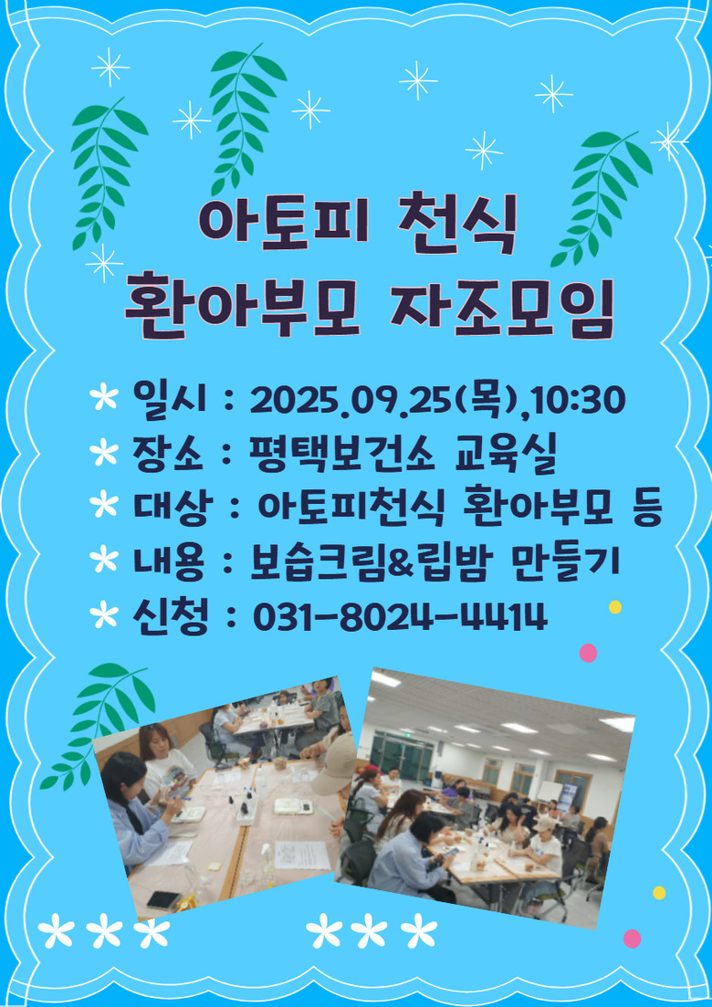 특히 평택보건소는 환아 부모들이 상시로 정보를 공유하고 소통할 수 있도록 인터넷 카페 ‘아토피야 잘가~’(https://cafe.naver.com/atopybyeby)를 함께 운영 중이다. 카페에서는 아토피·천식 관련 건강자료와 생활정보를 나누고, 자조모임 활동 소식도 확인할 수 있다.