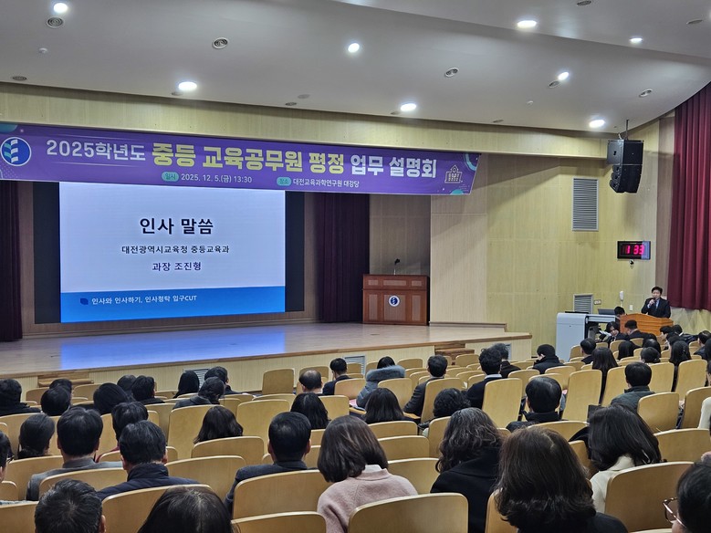 [대전 세계타임즈=이채봉 기자] 대전시교육청은 12월 5일, 8일 양일간 대전교육과학연구원에서 중·고·각종·특수학교 교감과 교사, 교육전문직원을 대상으로 2025학년도 중등 교육공무원 평정 업무 설명회를 개최했다.