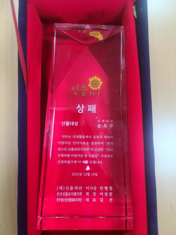 송옥주 의원은 “앞으로도 청소년들에게 모범이 될 수 있는 말을 많이 사용하여 일상생활과 인터넷상에서 아름다운 언어 사용 습관이 정착되도록 열심히 노력하겠다”며 “의정활동 또한 청소년들이 본받을 수 있도록 더욱 무거운 책임감을 가지고 열의를 다하여 이어가겠다”고 수상 소감을 밝혔다.