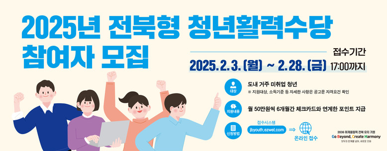 신청방법 등 자세한 사항은 ‘전북형 청년활력수당 홈페이지(jbyouth.ezwel.com)’를 참조하면 된다.