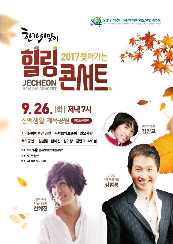 제천시는 한가위를 맞아 오는 26일 오후7시 제천 신백생활체육공원에서 ‘2017 찾아가는 힐링콘서트’를 개최한다.