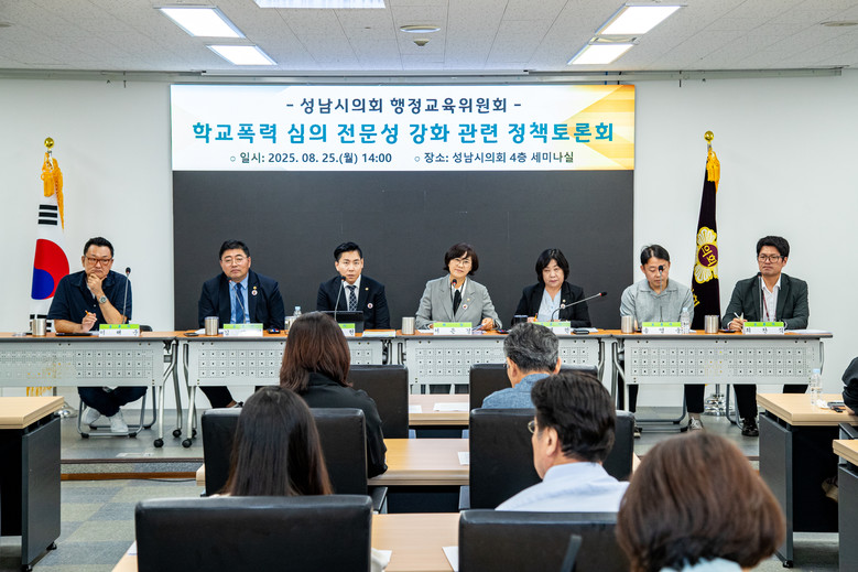 [성넘시 세계타임즈=송민수 기자] 성남시의회 행정교육위원회(위원장 서은경)는 8월 25일(월) 오후 2시, 성남시의회 4층 세미나실에서 ‘학교폭력 심의 전문성 및 피해자 보호 방안 강화’를 주제로 정책토론회를 개최했다.