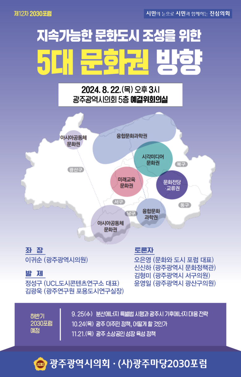 토론자로 오은영 포럼 문화와 도시 대표, 김형미 서구의원, 윤영일 광산구의원, 신신하 광주광역시 문화정책관 등이 참여한다.