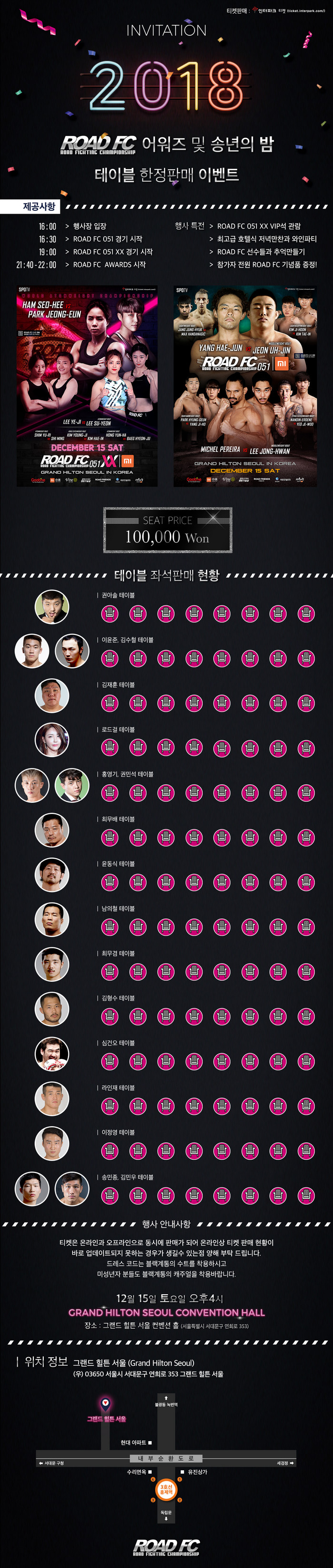 좌석은 테이블석으로 ROAD FC 라이트급 챔피언 권아솔 테이블 등 총 14개의 테이블이 준비돼 있다. 각 테이블당 판매 가능 좌석은 8개로 총 112석만 1인 10만원으로 한정 판매된다.
