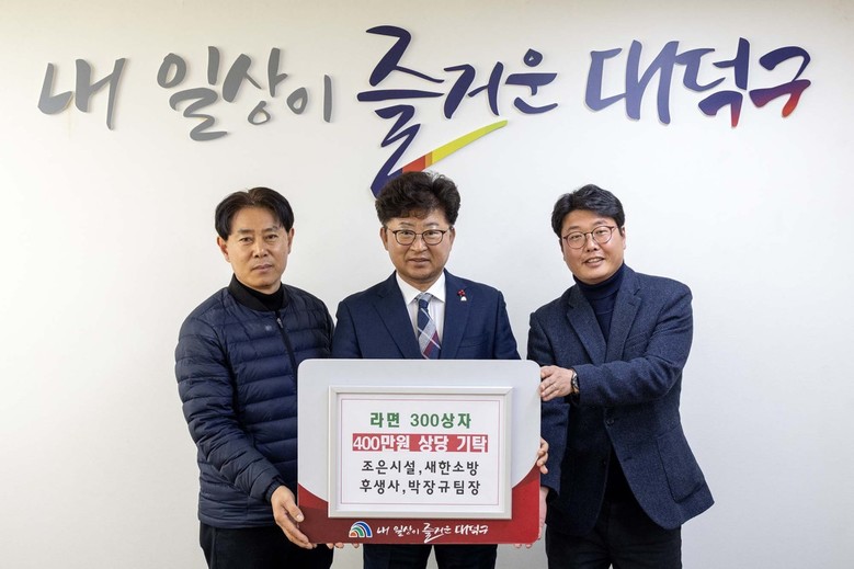 [대덕구 세계타임즈=이채봉 기자] 대전 대덕구(구청장 최충규)는 18일 조은시설(대표 김영민), 새한소방(대표 이승재), 중리시장 후생사(대표 유인홍)와 박장규 대덕구 주택경관과 팀장으로부터 400만원 상당의 라면을 기탁받았다.