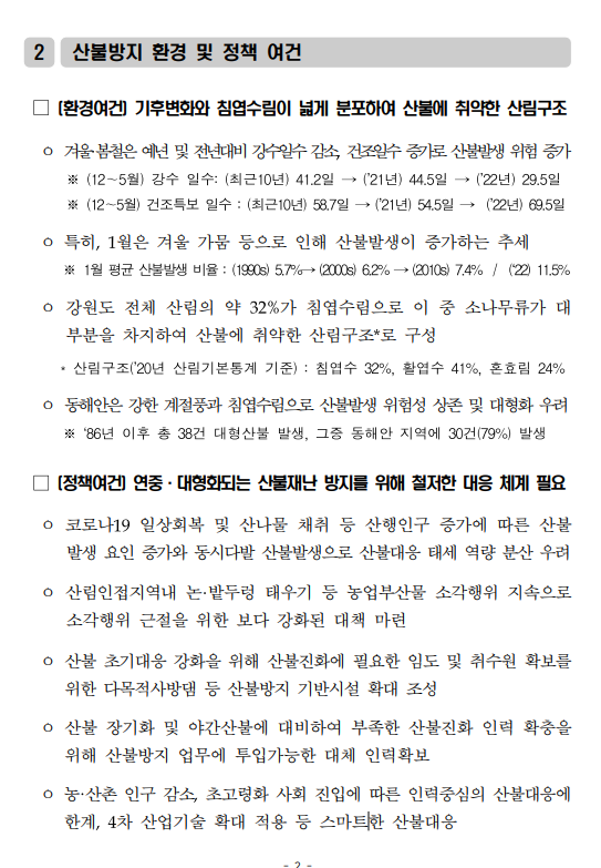 최근에는 연중 고온현상, 낮은 강수량, 건조일수 증가로 산불발생이 연중 지속되고 있는 추세이다.