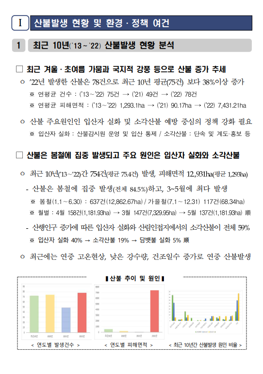 최근 10년간(’13∼’22) 산불발생 현황을 분석한 강원소방본부 자료에 의하면, 산불은 상반기에 집중 발생(전체 84.5%)하고, 3~5월에 최다 발생한 것으로 나타났다.