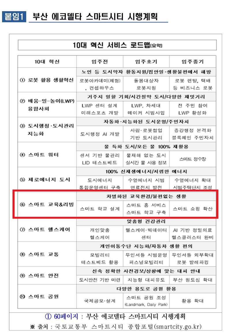 ◈ 국토부 스마트시티 종합포털에 게시된 ‘부산 에코델타 스마트시티 시행계획’을 보면, ‘10대 혁신 서비스’에 ‘스마트 학교’와 ‘스마트 교육’이 분명히 포함돼 있으며, AR·VR 체험교실 운영 등